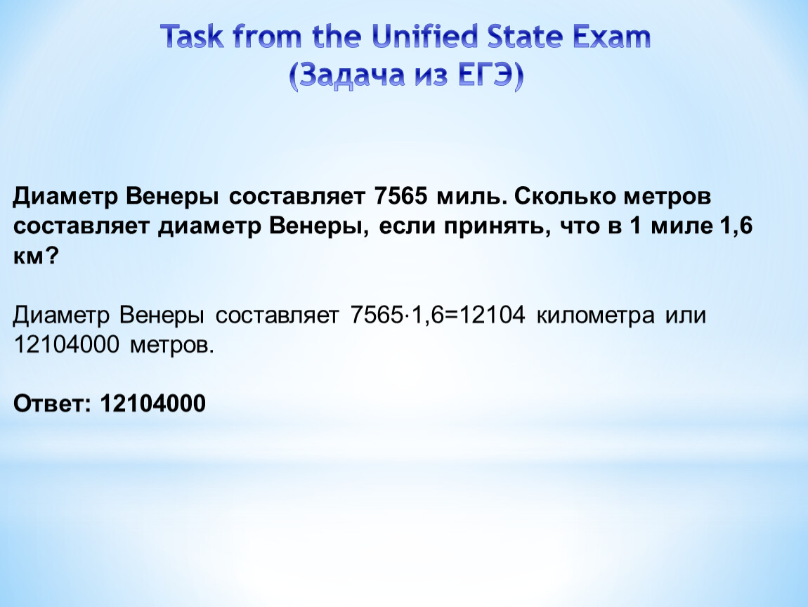 Диаметр Венеры составляет 7565 миль. Сколько метров составляет диаметр Венеры, если принять, что в 1 миле 1,6 км?