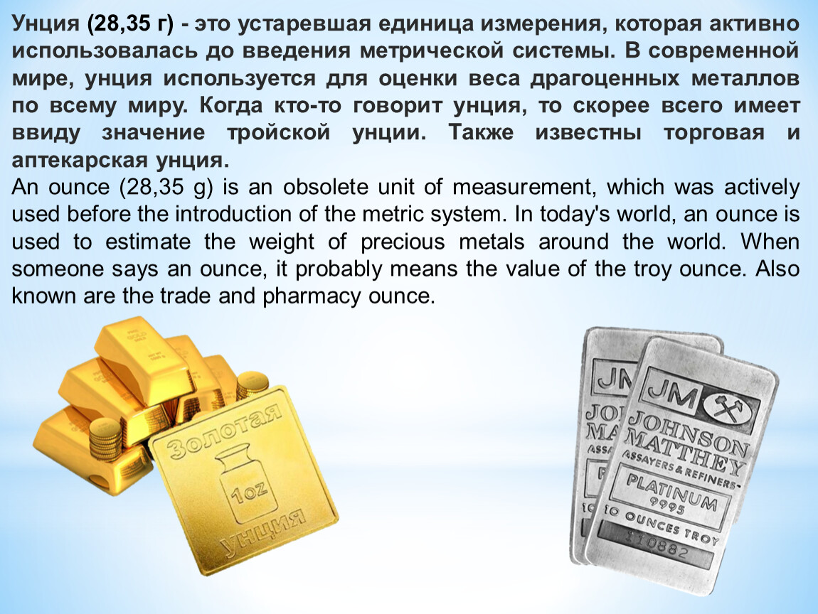Унция (28,35 г) - это устаревшая единица измерения, которая активно использовалась до введения метрической системы. В современной мире, унция используется для оценки веса драгоценных металлов по всему миру. Когда кто-то говорит унция, то скорее всего имеет ввиду значение тройской унции. Также известны торговая и аптекарская унция.