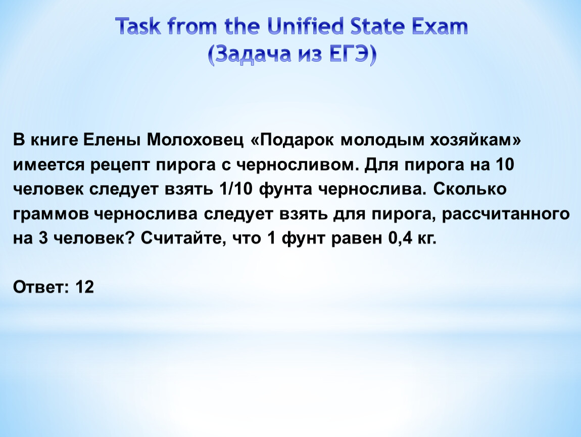 В книге Елены Молоховец «Подарок молодым хозяйкам» имеется рецепт пирога с черносливом. Для пирога на 10 человек следует взять 1/10 фунта чернослива. Сколько граммов чернослива следует взять для пирога, рассчитанного на 3 человек? Считайте, что 1 фунт равен 0,4 кг.