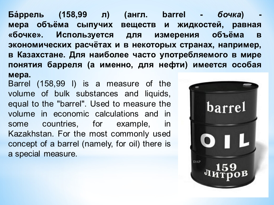 Barrel (158,99 l) is a measure of the volume of bulk substances and liquids, equal to the "barrel". Used to measure the volume in economic calculations and in some countries, for example, in Kazakhstan. For the most commonly used concept of a barrel (namely, for oil) there is a special measure.