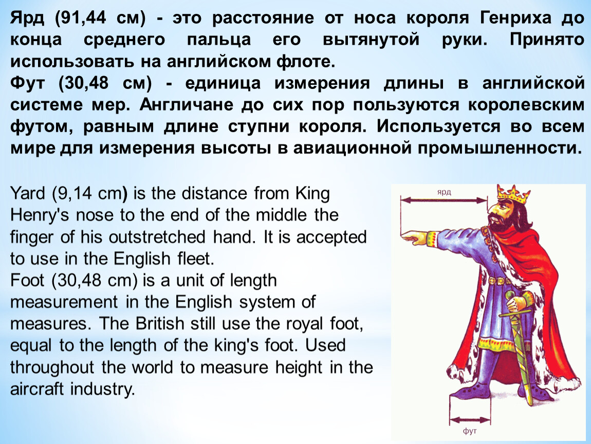 Ярд (91,44 см) - это расстояние от носа короля Генриха до конца среднего пальца его вытянутой руки. Принято использовать на английском флоте.