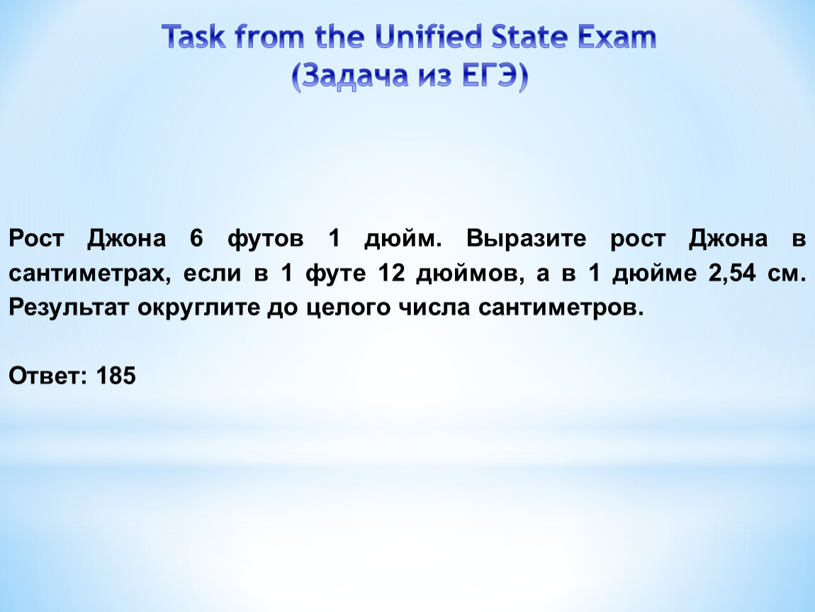 Рост Джона 6 футов 1 дюйм. Выразите рост Джона в сантиметрах, если в 1 футе 12 дюймов, а в 1 дюйме 2,54 см. Результат округлите до целого числа сантиметров.