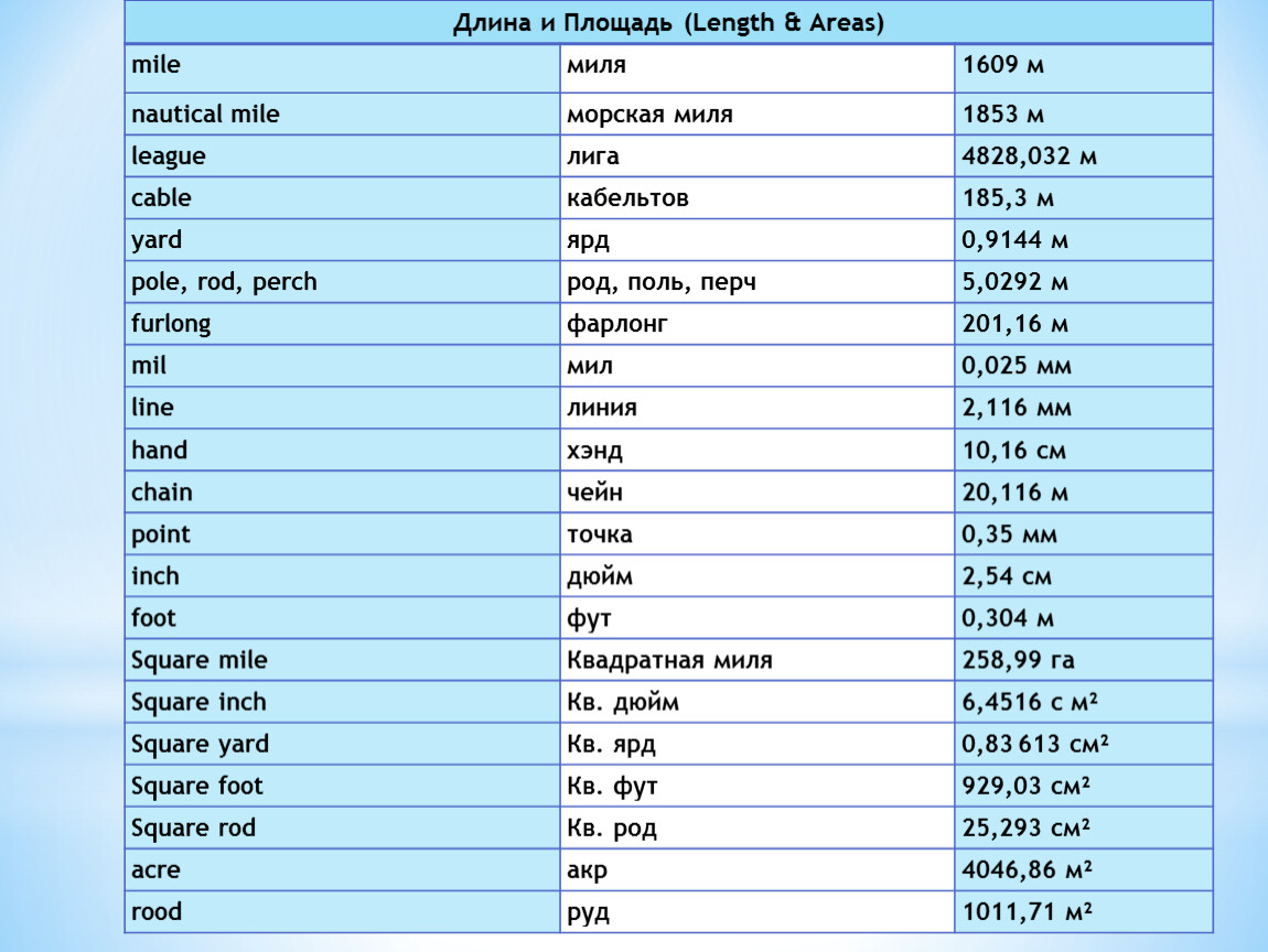 Длина и Площадь (Length & Areas) | ||