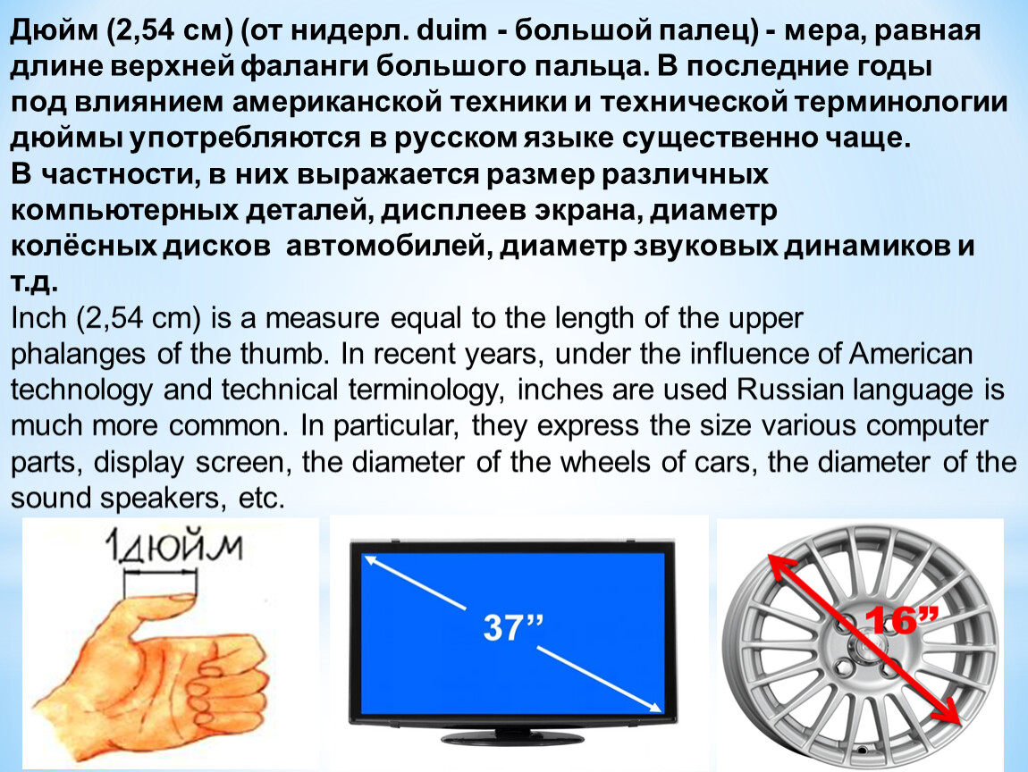 Дюйм (2,54 см) (от нидерл. duim - большой палец) - мера, равная длине верхней фаланги большого пальца. В последние годы