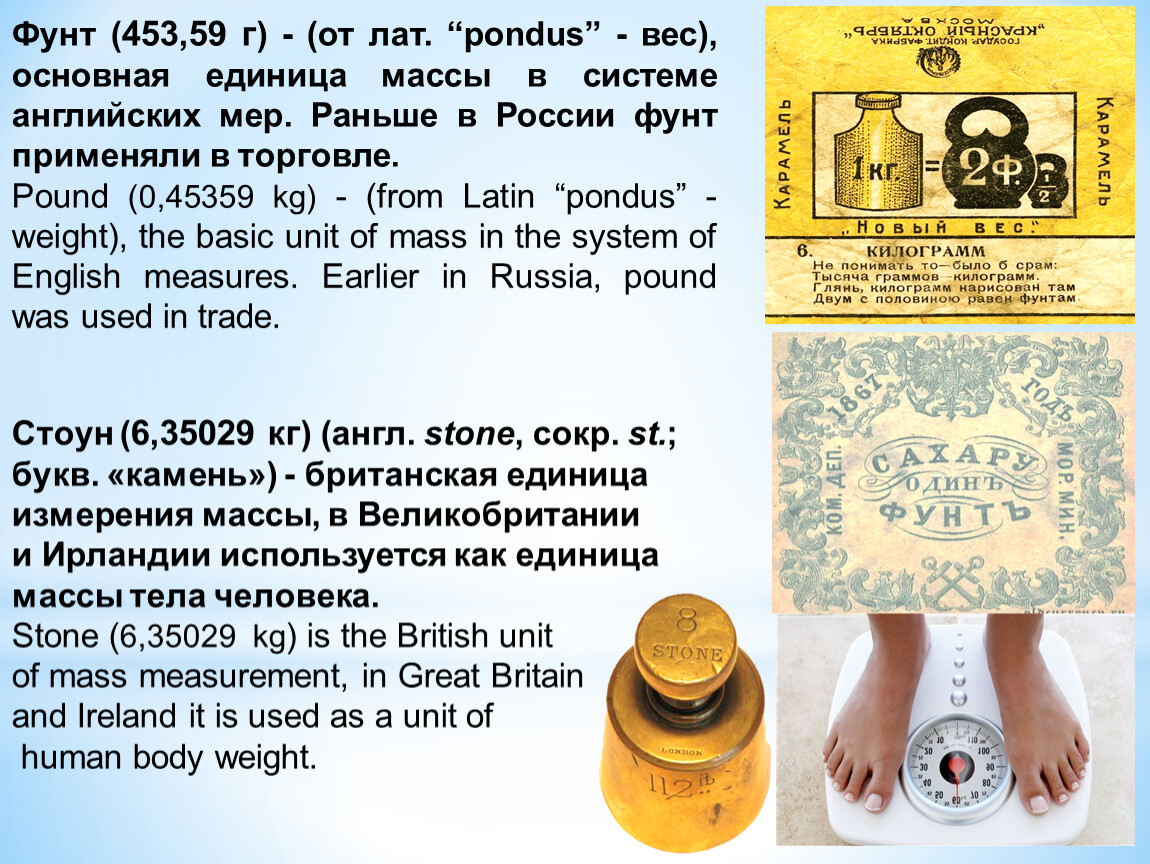 Фунт (453,59 г) - (от лат. “pondus” - вес), основная единица массы в системе английских мер. Раньше в России фунт применяли в торговле.
