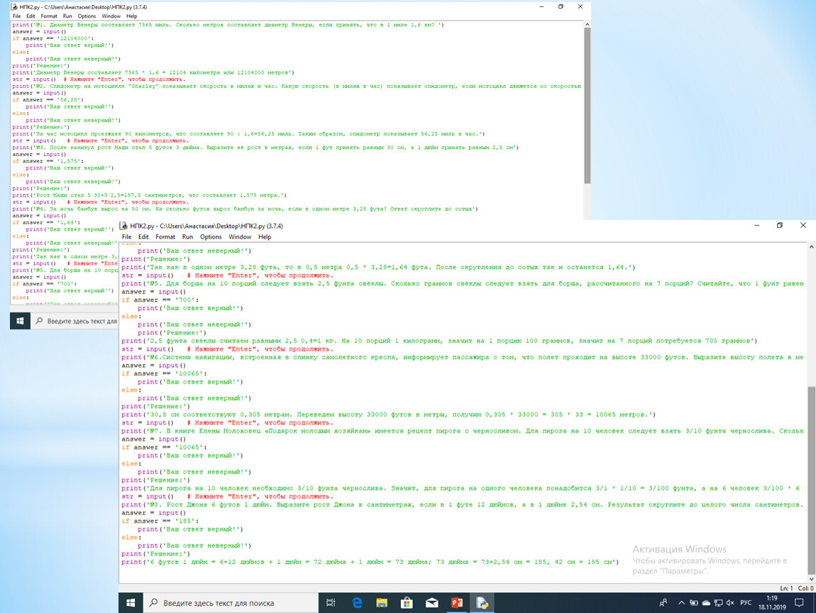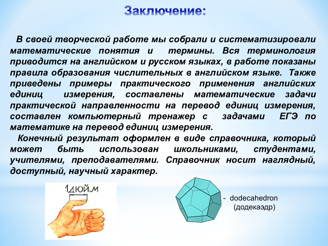 В своей творческой работе мы собрали и систематизировали математические понятия и термины. Вся терминология приводится на английском и русском языках, в работе показаны правила образования числительных в английском языке. Также приведены примеры практического применения английских единиц измерения, составлены математические задачи практической направленности на перевод единиц измерения, составлен компьютерный тренажер с задачами ЕГЭ по математике на перевод единиц измерения.