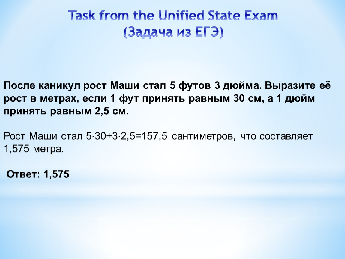 После каникул рост Маши стал 5 футов 3 дюйма. Выразите её рост в метрах, если 1 фут принять равным 30 см, а 1 дюйм принять равным 2,5 см.