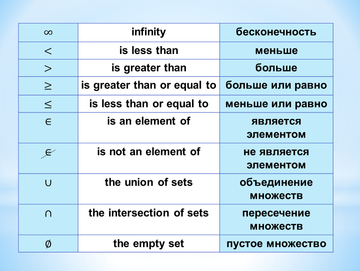 ∞ | infinity | бесконечность |
