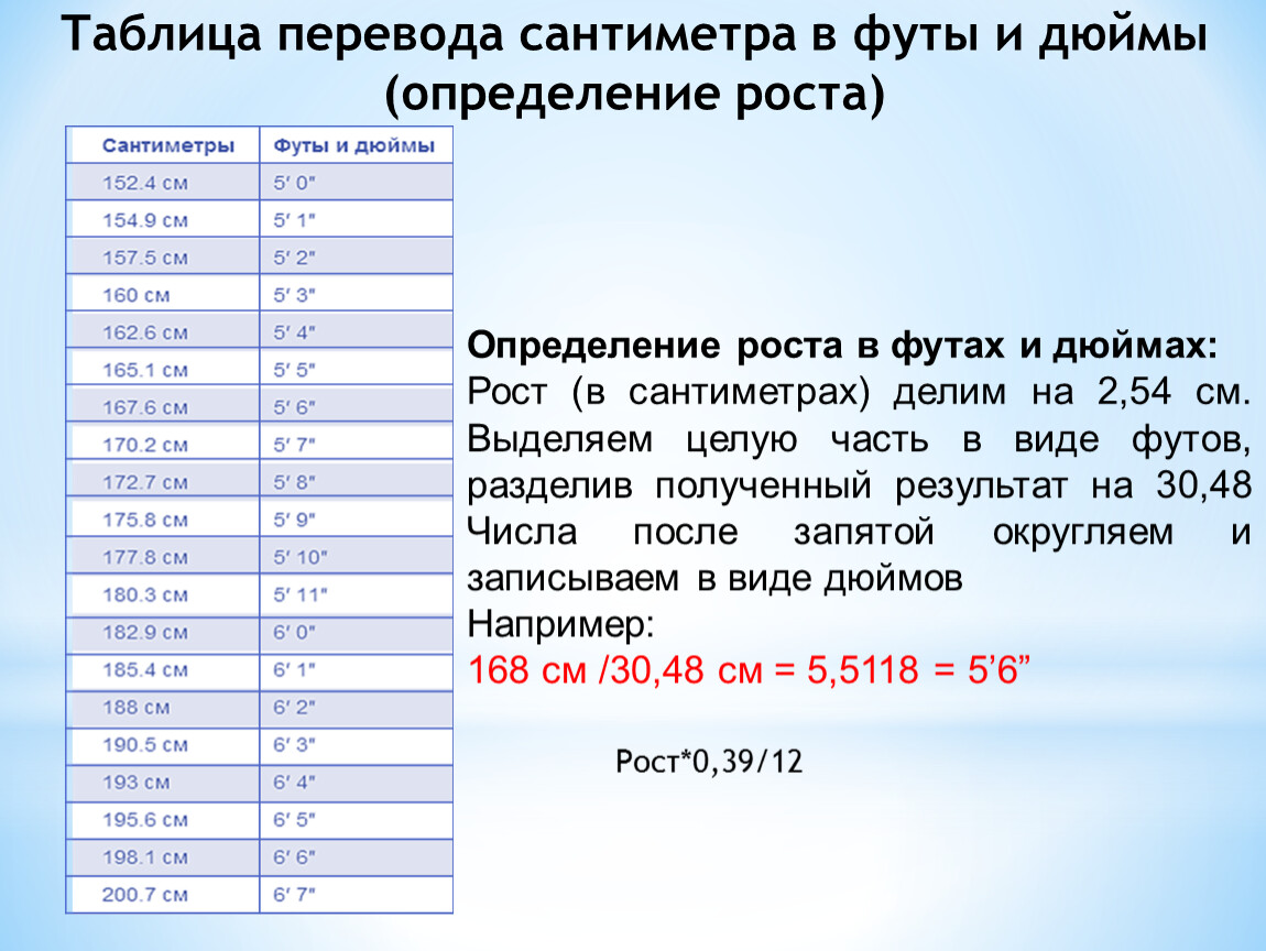 Таблица перевода сантиметра в футы и дюймы