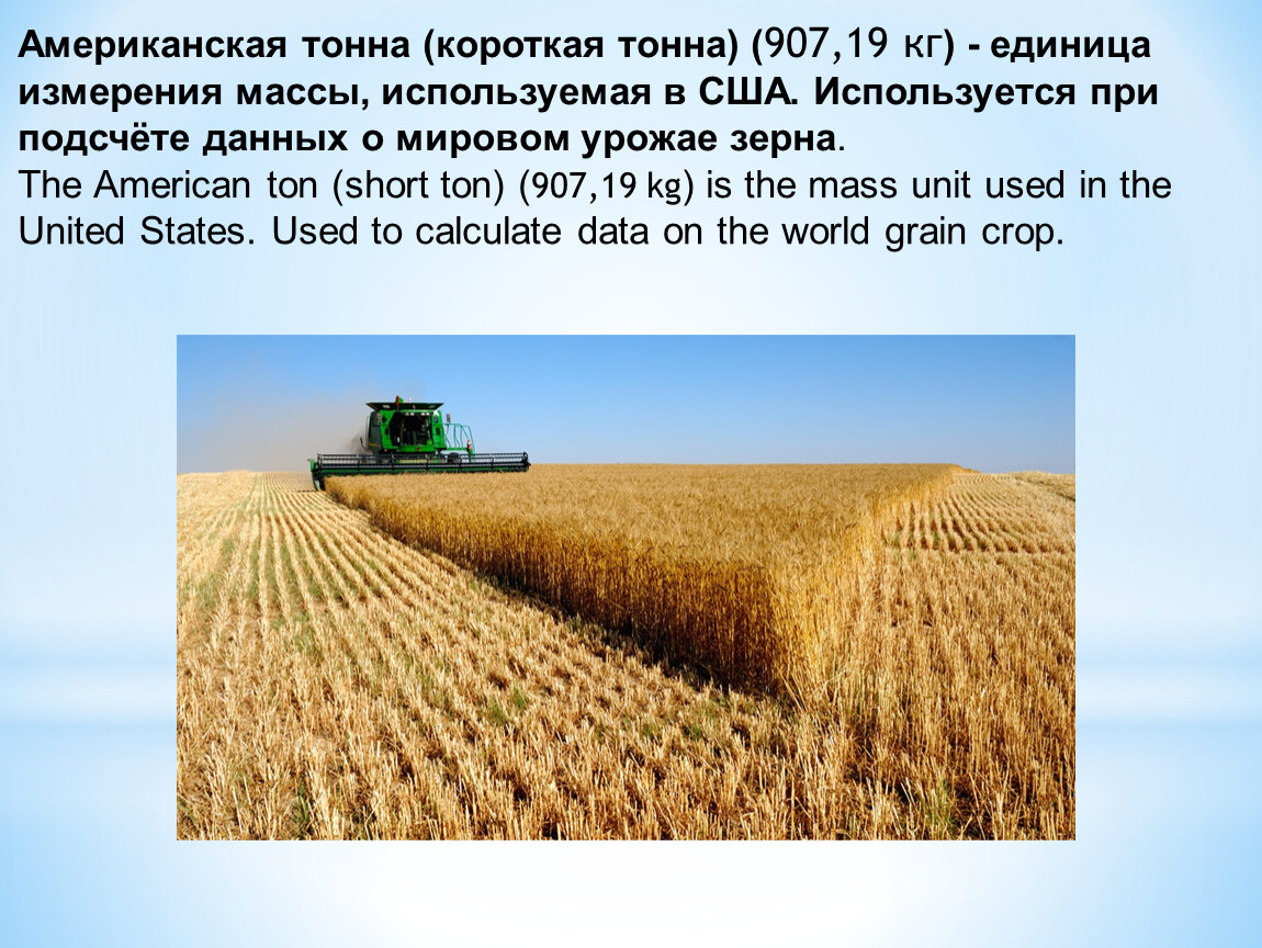 Американская тонна (короткая тонна) (907,19 кг) - единица измерения массы, используемая в США. Используется при подсчёте данных о мировом урожае зерна.