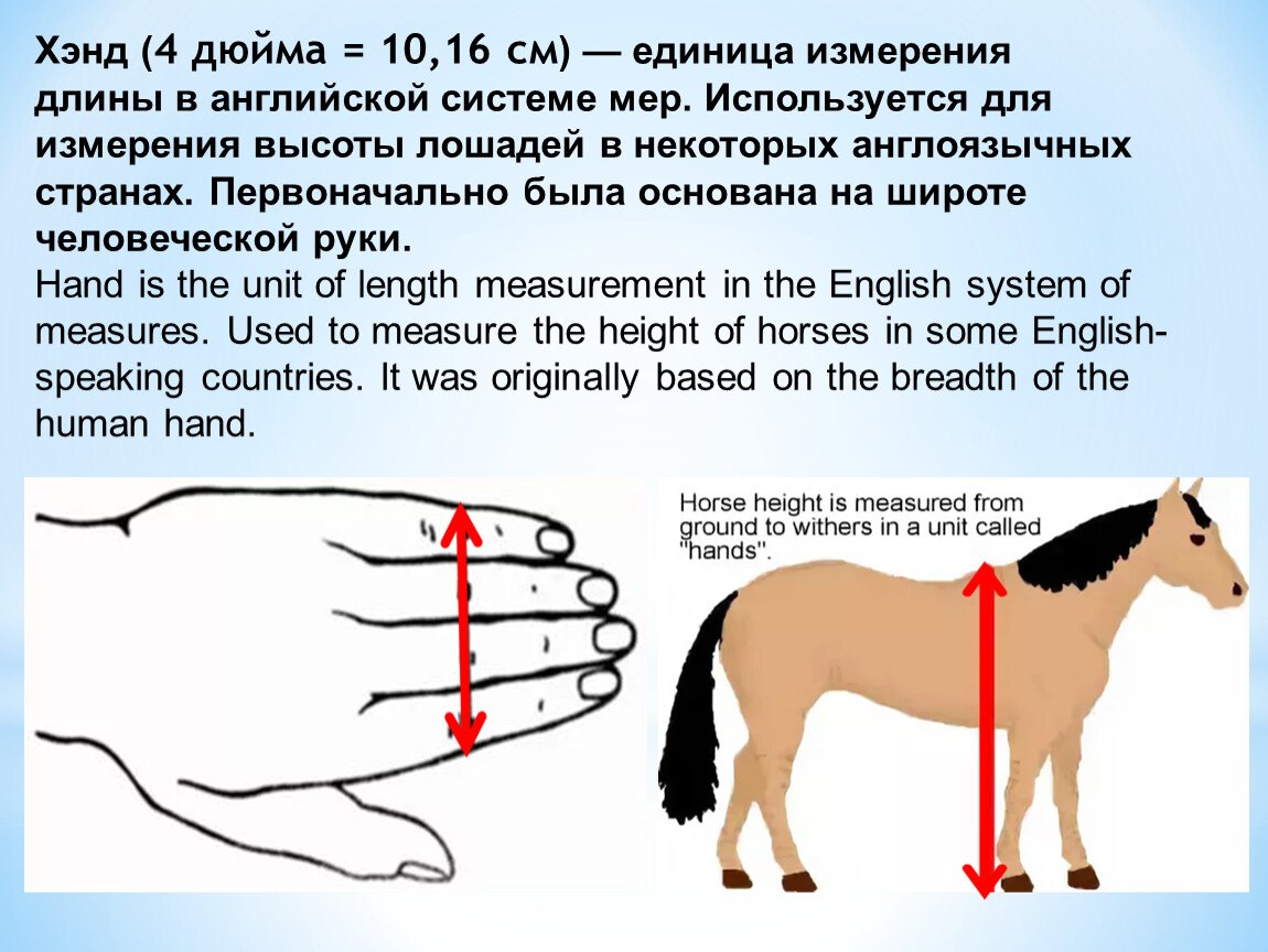 Хэнд (4 дюйма = 10,16 см) — единица измерения длины в английской системе мер. Используется для измерения высоты лошадей в некоторых англоязычных странах. Первоначально была основана на широте человеческой руки.