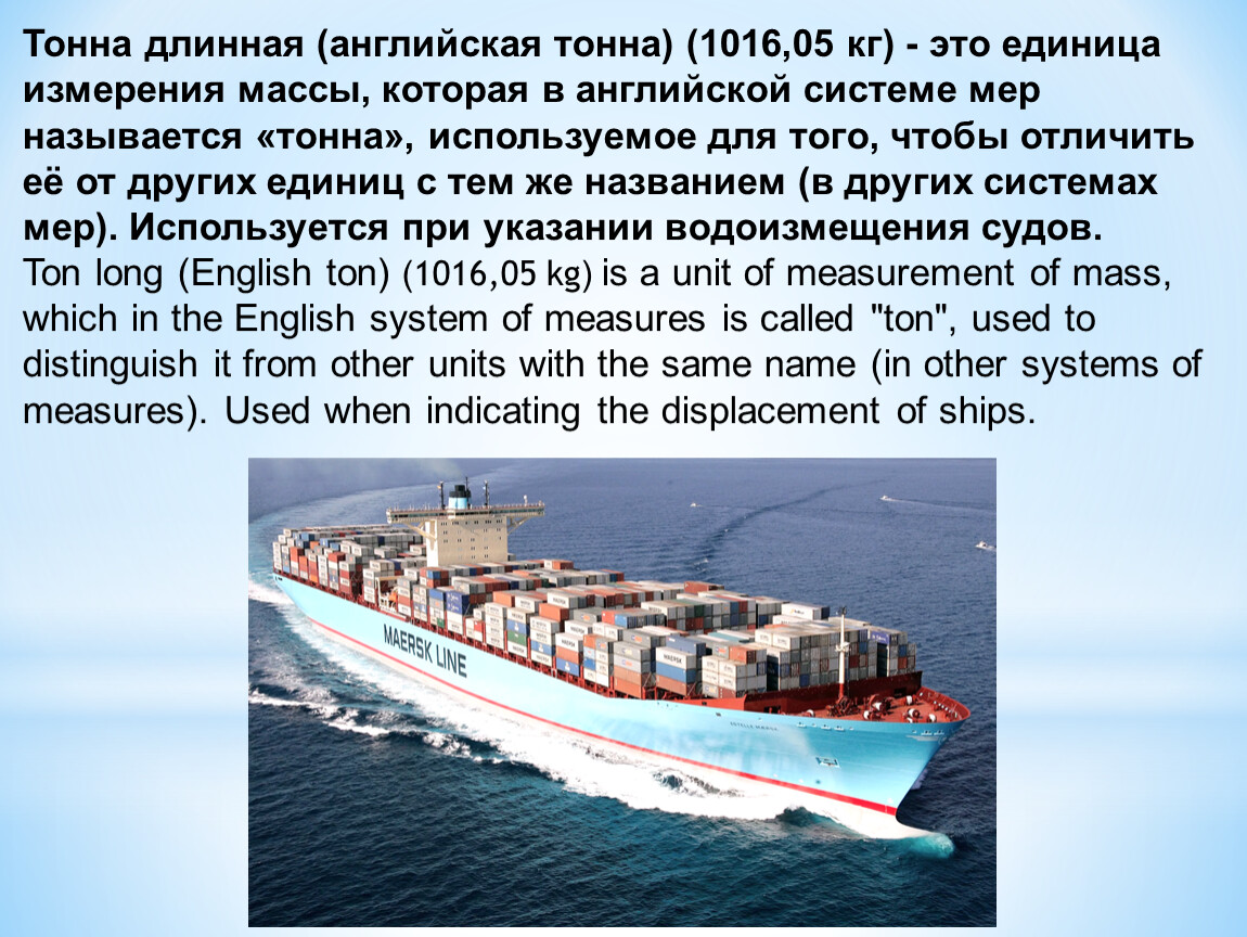 Тонна длинная (английская тонна) (1016,05 кг) - это единица измерения массы, которая в английской системе мер называется «тонна», используемое для того, чтобы отличить её от других единиц с тем же названием (в других системах мер). Используется при указании водоизмещения судов.