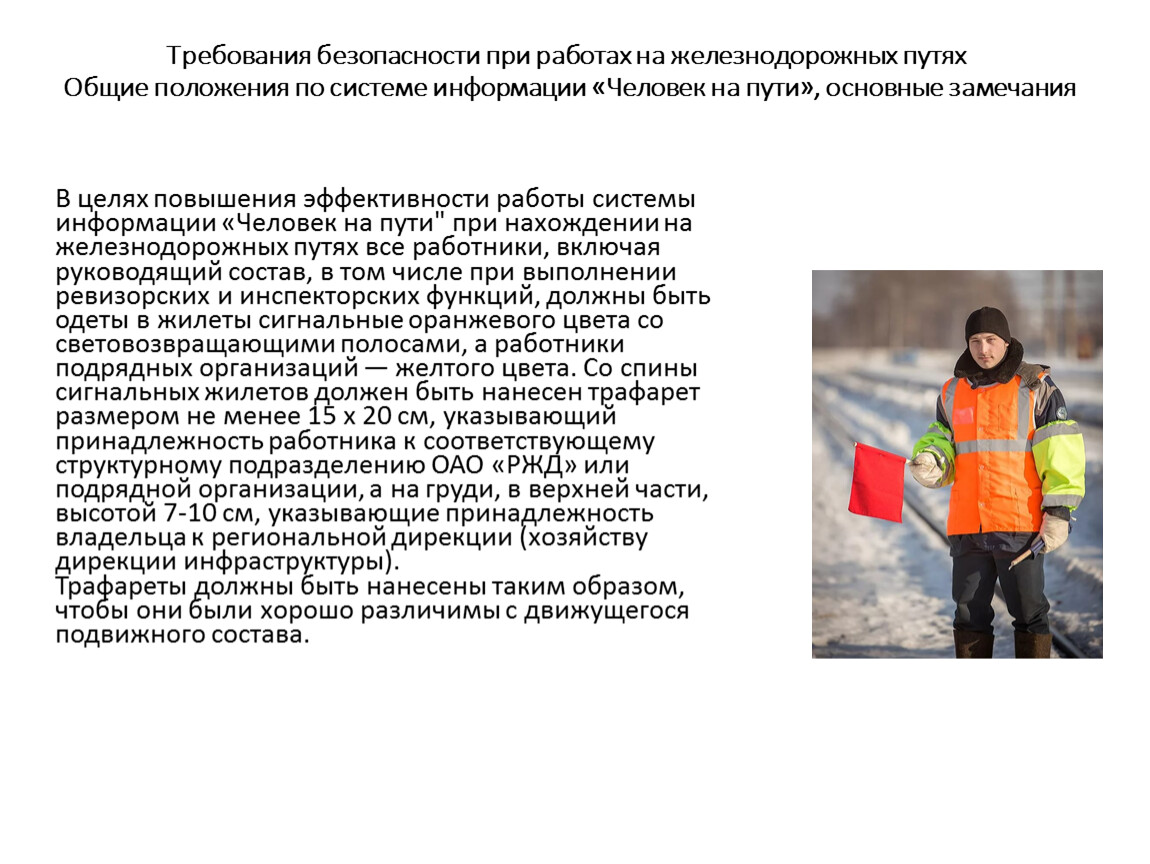 В целях повышения эффективности работы системы информации «Человек на пути" при нахождении на железнодорожных путях все работники, включая руководящий состав, в том числе при выполнении ревизорских и инспекторских функций, должны быть одеты в жилеты сигнальные оранжевого цвета со световозвращающими полосами, а работники подрядных организаций — желтого цвета. Со спины сигнальных жилетов должен быть нанесен трафарет размером не менее 15 х 20 см, указывающий принадлежность работника к соответствующему структурному подразделению ОАО «РЖД» или подрядной организации, а на груди, в верхней части, высотой 7-10 см, указывающие принадлежность владельца к региональной дирекции (хозяйству дирекции инфраструктуры).Трафареты должны быть нанесены таким образом, чтобы они были хорошо различимы с движущегося подвижного состава.