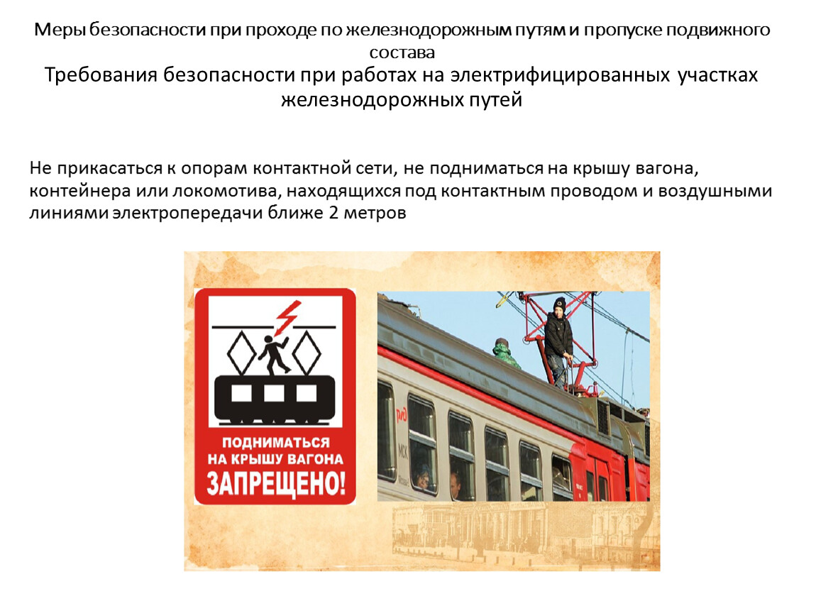 Не прикасаться к опорам контактной сети, не подниматься на крышу вагона, контейнера или локомотива, находящихся под контактным проводом и воздушными линиями электропередачи ближе 2 метров