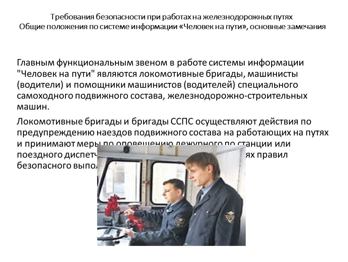 Главным функциональным звеном в работе системы информации "Человек на пути" являются локомотивные бригады, машинисты (водители) и помощники машинистов (водителей) специального самоходного подвижного состава, железнодорожно-строительных машин.