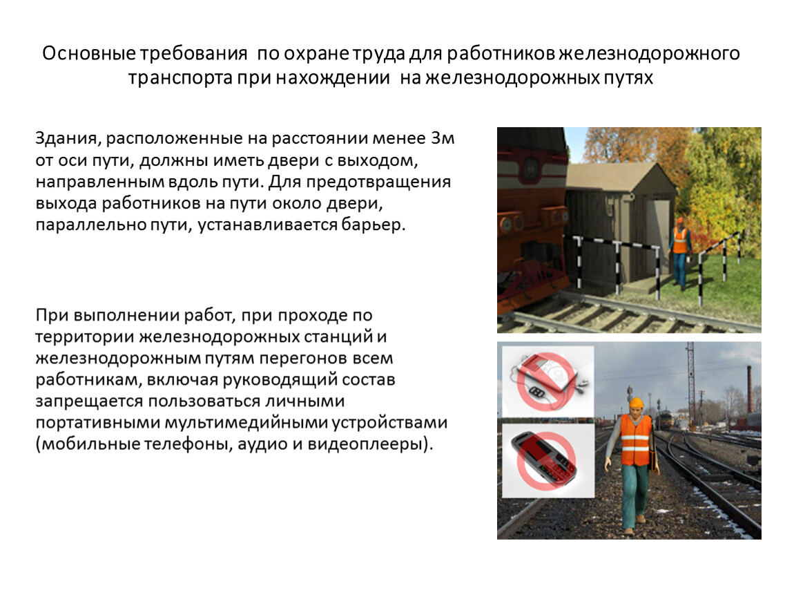 При выполнении работ, при проходе по территории железнодорожных станций и железнодорожным путям перегонов всем работникам, включая руководящий состав запрещается пользоваться личными портативными мультимедийными устройствами (мобильные телефоны, аудио и видеоплееры).