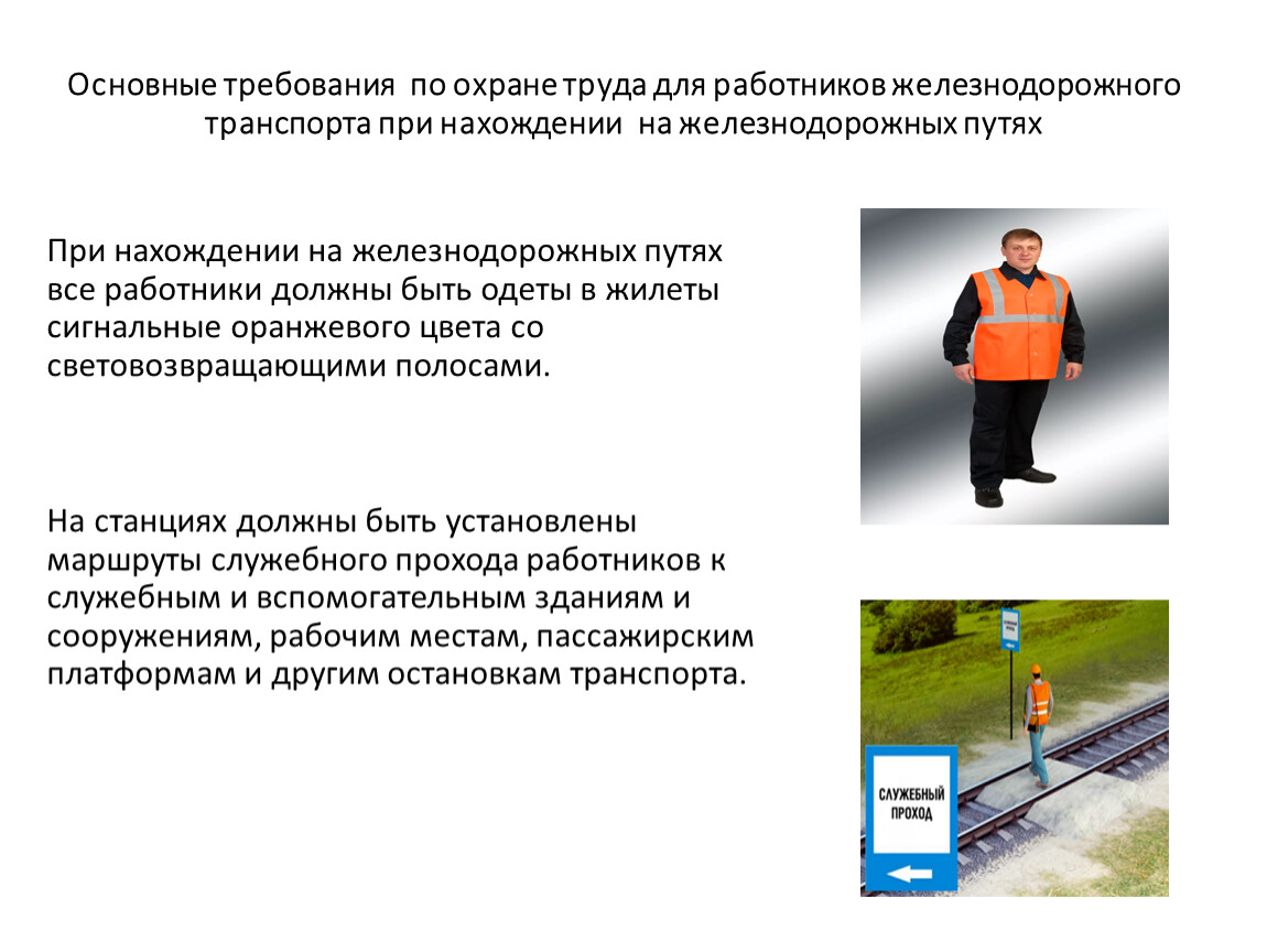 При нахождении на железнодорожных путях все работники должны быть одеты в жилеты сигнальные оранжевого цвета со световозвращающими полосами.