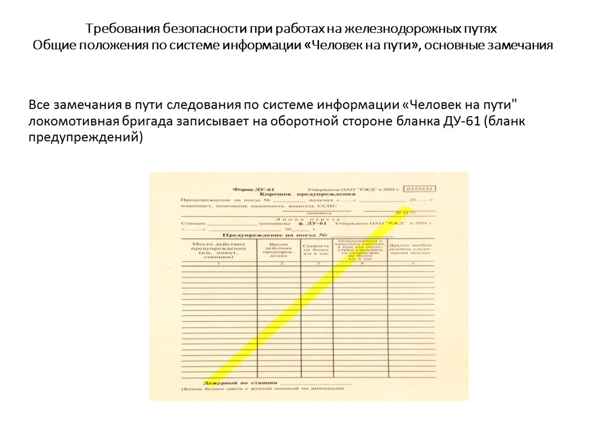 Все замечания в пути следования по системе информации «Человек на пути" локомотивная бригада записывает на оборотной стороне бланка ДУ-61 (бланк предупреждений)