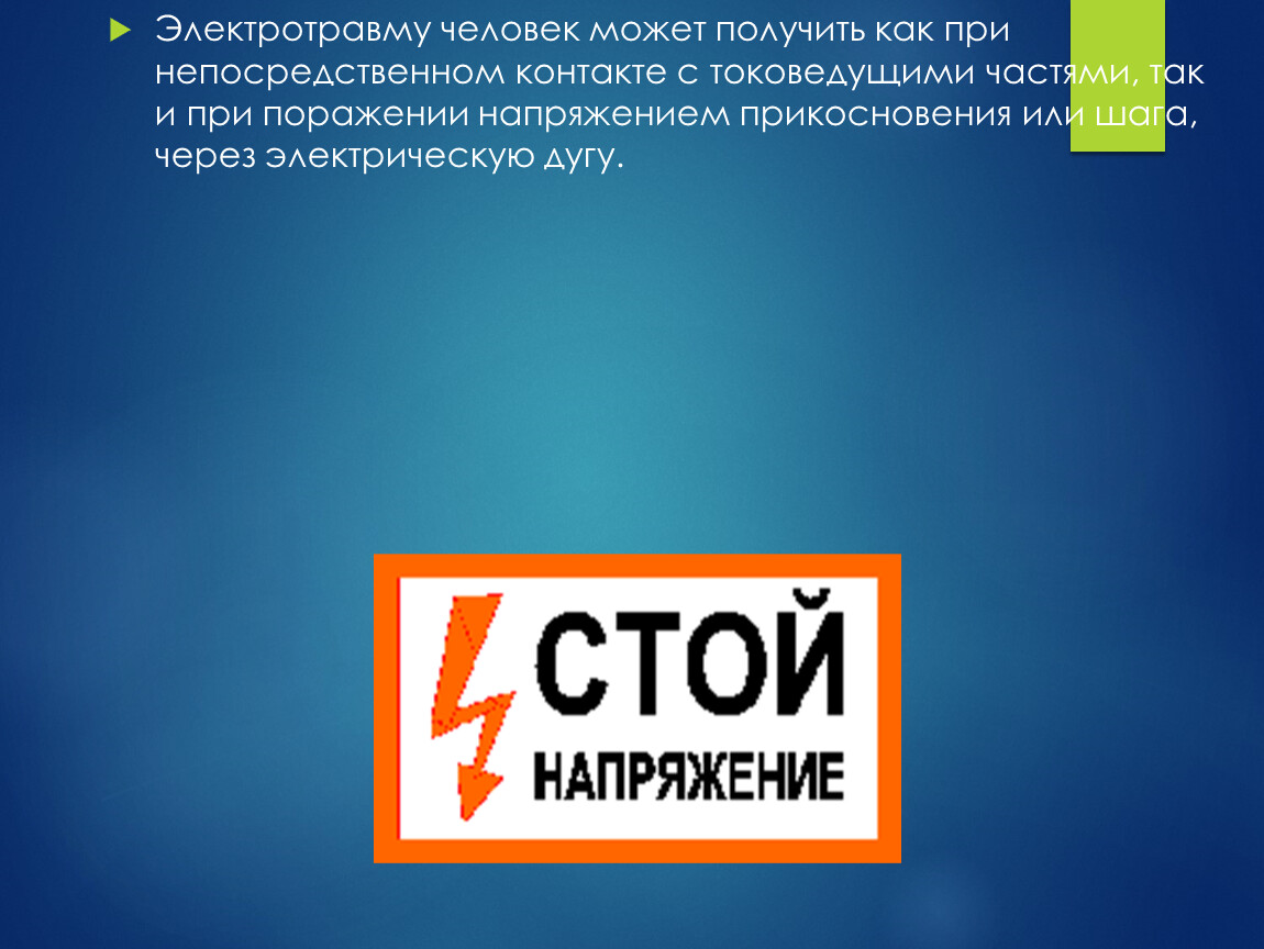 Электротравму человек может получить как при непосредственном контакте с токоведущими частями, так и при поражении напряжением прикосновения или шага, через электрическую дугу.