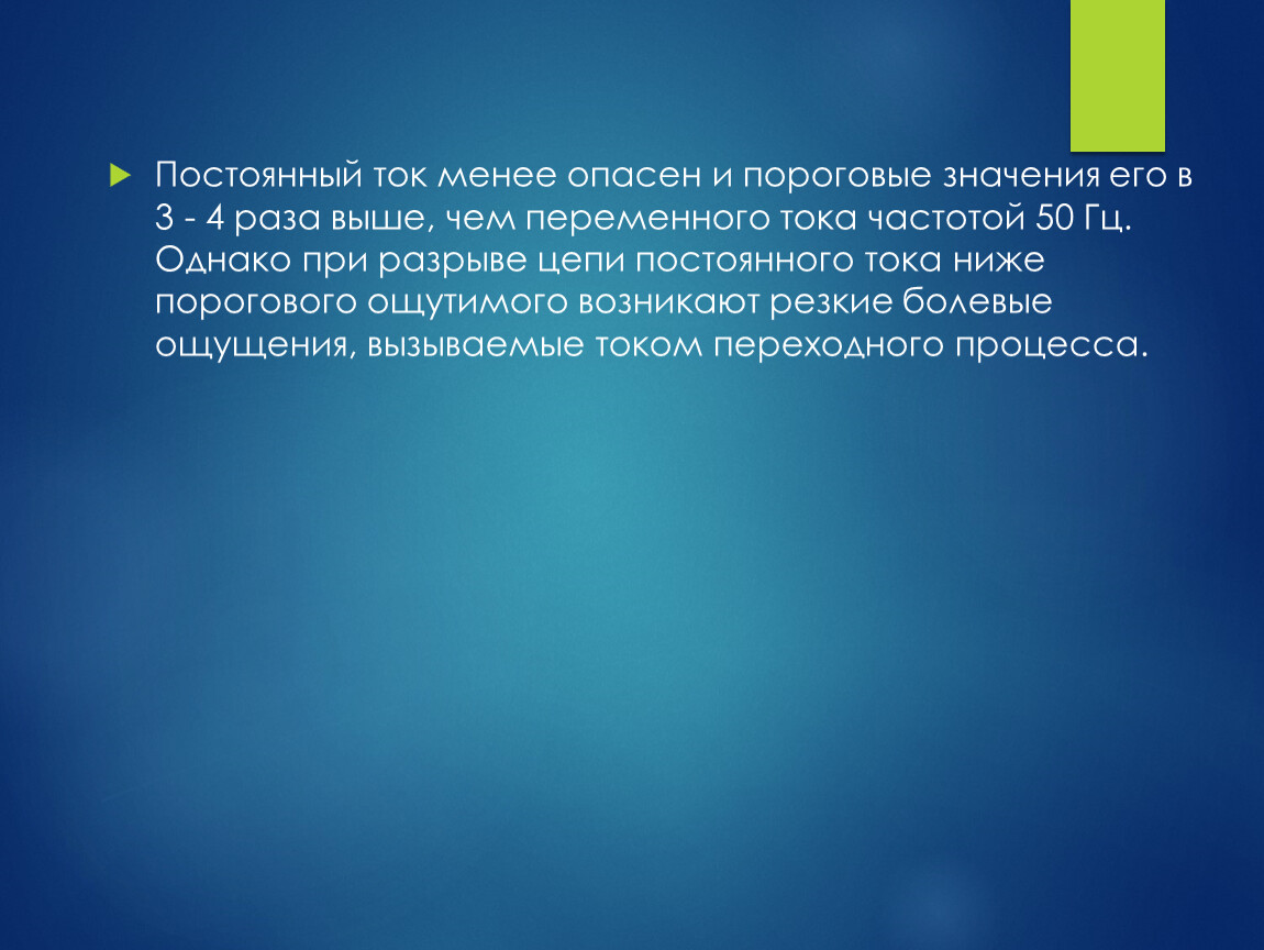 Постоянный ток менее опасен и пороговые значения его в 3 - 4 раза выше, чем переменного тока частотой 50 Гц. Однако при разрыве цепи постоянного тока ниже порогового ощутимого возникают резкие болевые ощущения, вызываемые током переходного процесса.