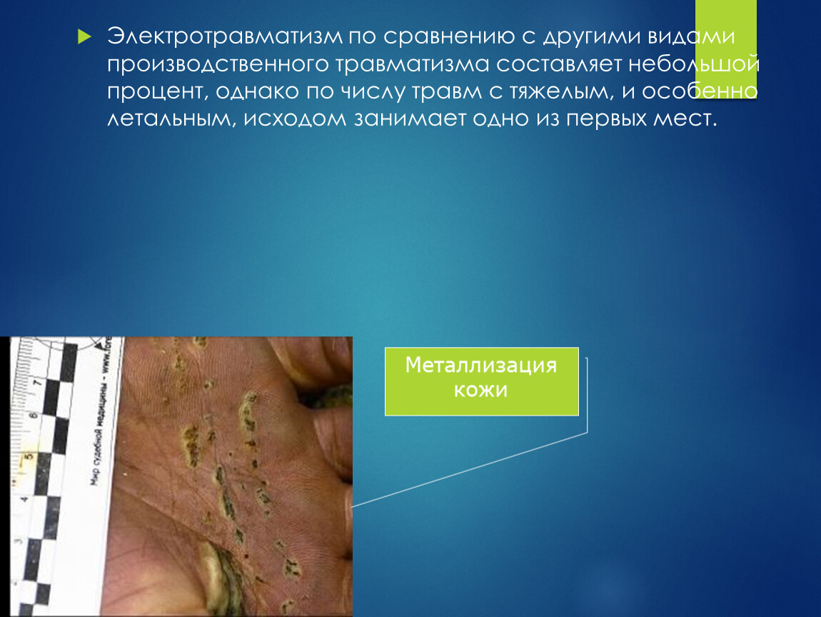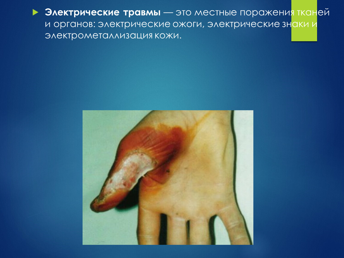 Электрические травмы — это местные поражения тканей и органов: электрические ожоги, электрические знаки и электрометаллизация кожи.