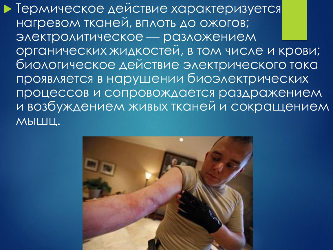 Термическое действие характеризуется нагревом тканей, вплоть до ожогов; электролитическое — разложением органических жидкостей, в том числе и крови; биологическое действие электрического тока проявляется в нарушении биоэлектрических процессов и сопровождается раздражением и возбуждением живых тканей и сокращением мышц.
