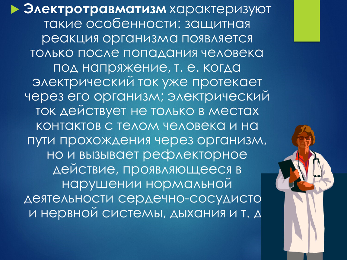 Электротравматизм характеризуют такие особенности: защитная реакция организма появляется только после попадания человека под напряжение, т. е. когда электрический ток уже протекает через его организм; электрический ток действует не только в местах контактов с телом человека и на пути прохождения через организм, но и вызывает рефлекторное действие, проявляющееся в нарушении нормальной деятельности сердечно-сосудистой и нервной системы, дыхания и т. д.