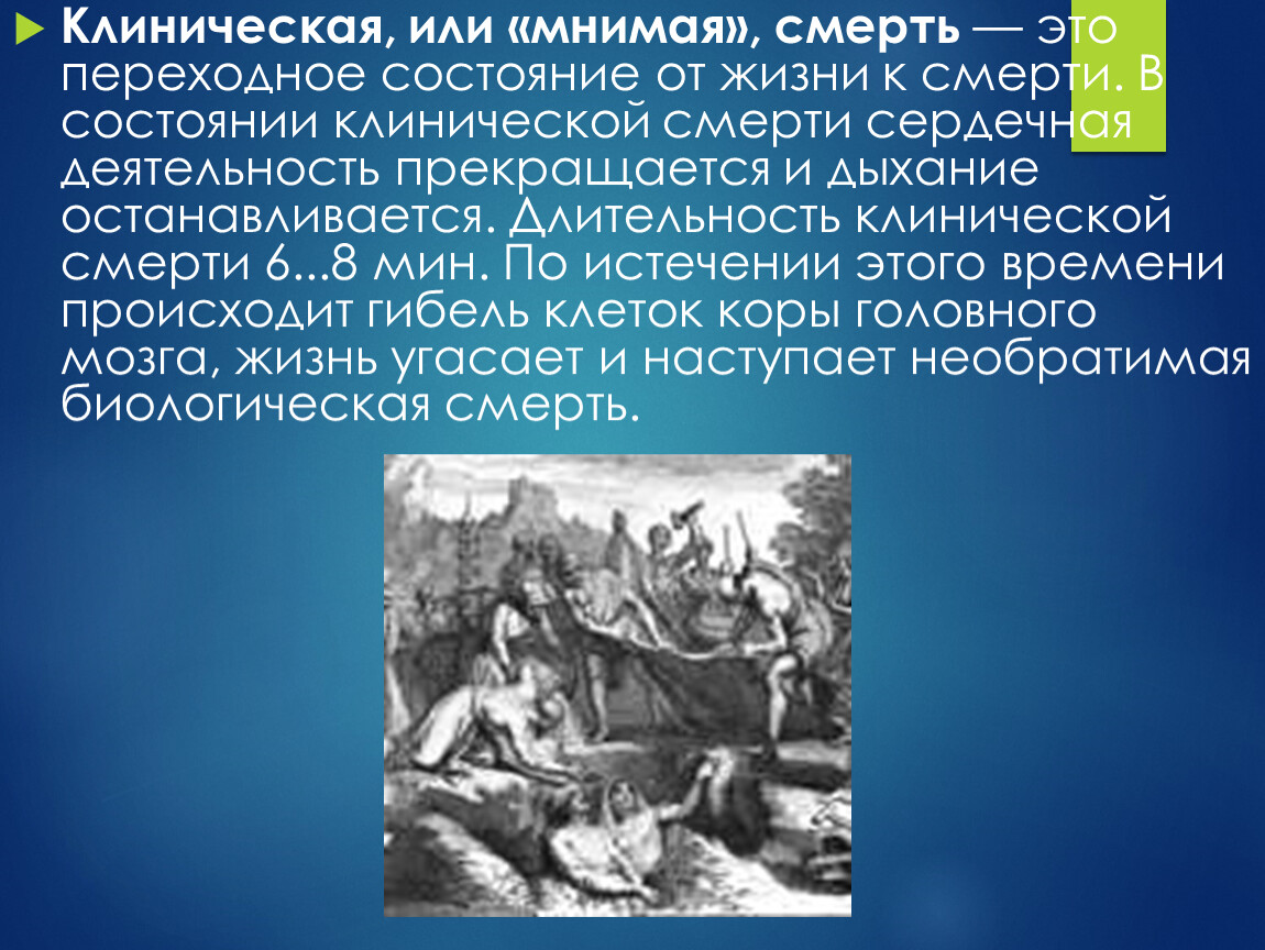Клиническая, или «мнимая», смерть — это переходное состояние от жизни к смерти. В состоянии клинической смерти сердечная деятельность прекращается и дыхание останавливается. Длительность клинической смерти 6...8 мин. По истечении этого времени происходит гибель клеток коры головного мозга, жизнь угасает и наступает необратимая биологическая смерть.