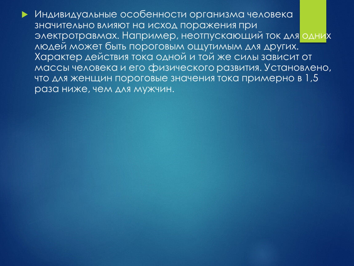 Индивидуальные особенности организма человека значительно влияют на исход поражения при электротравмах. Например, неотпускающий ток для одних людей может быть пороговым ощутимым для других. Характер действия тока одной и той же силы зависит от массы человека и его физического развития. Установлено, что для женщин пороговые значения тока примерно в 1,5 раза ниже, чем для мужчин.