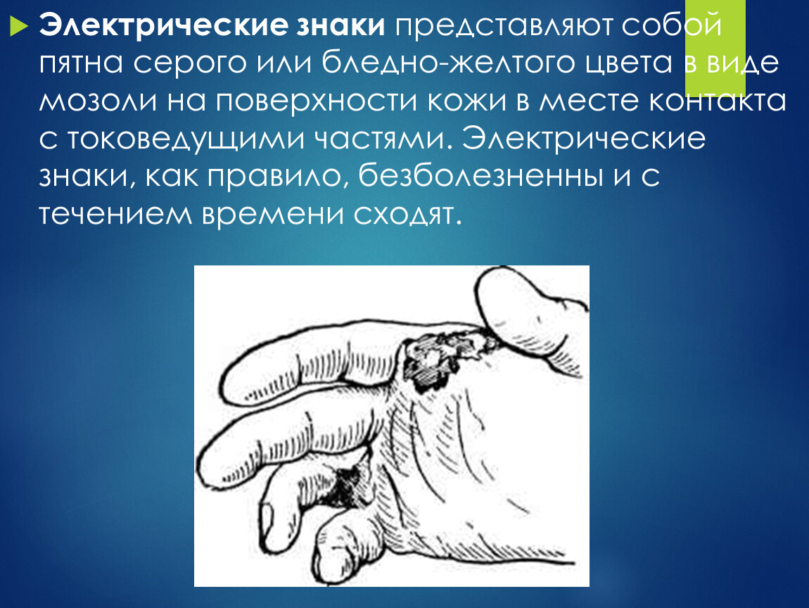 Электрические знаки представляют собой пятна серого или бледно-желтого цвета в виде мозоли на поверхности кожи в месте контакта с токоведущими частями. Электрические знаки, как правило, безболезненны и с течением времени сходят.