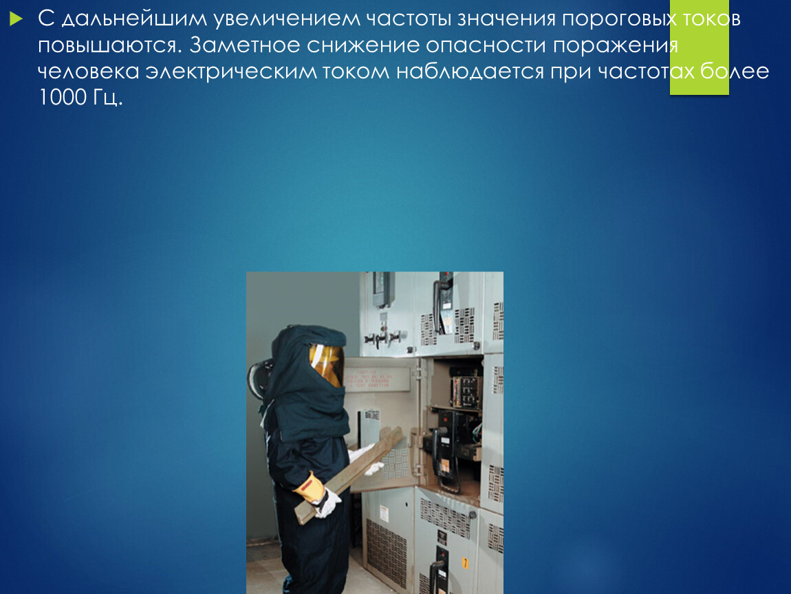 С дальнейшим увеличением частоты значения пороговых токов повышаются. Заметное снижение опасности поражения человека электрическим током наблюдается при частотах более 1000 Гц.