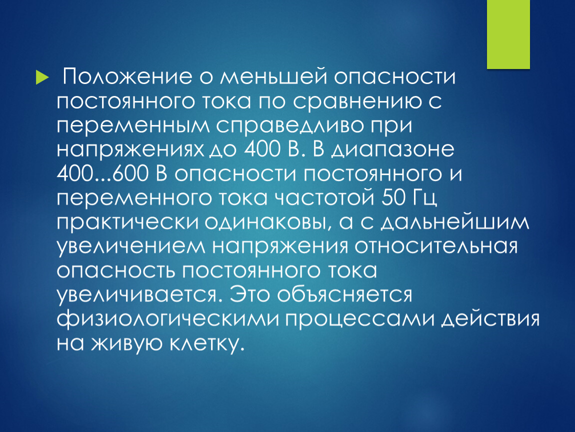 Положение о меньшей опасности постоянного тока по сравнению с переменным справедливо при напряжениях до 400 В. В диапазоне 400...600 В опасности постоянного и переменного тока частотой 50 Гц практически одинаковы, а с дальнейшим увеличением напряжения относительная опасность постоянного тока увеличивается. Это объясняется физиологическими процессами действия на живую клетку.