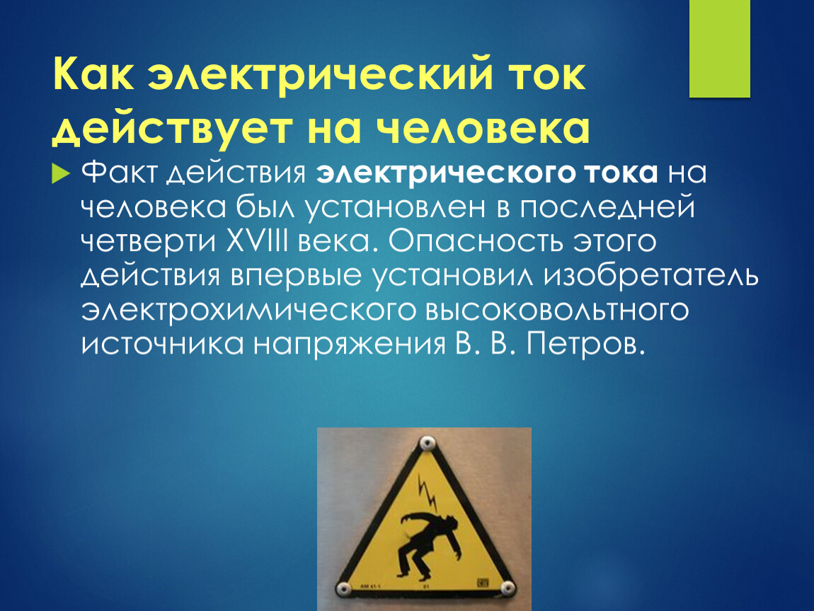 Факт действия электрического тока на человека был установлен в последней четверти XVIII века. Опасность этого действия впервые установил изобретатель электрохимического высоковольтного источника напряжения В. В. Петров.