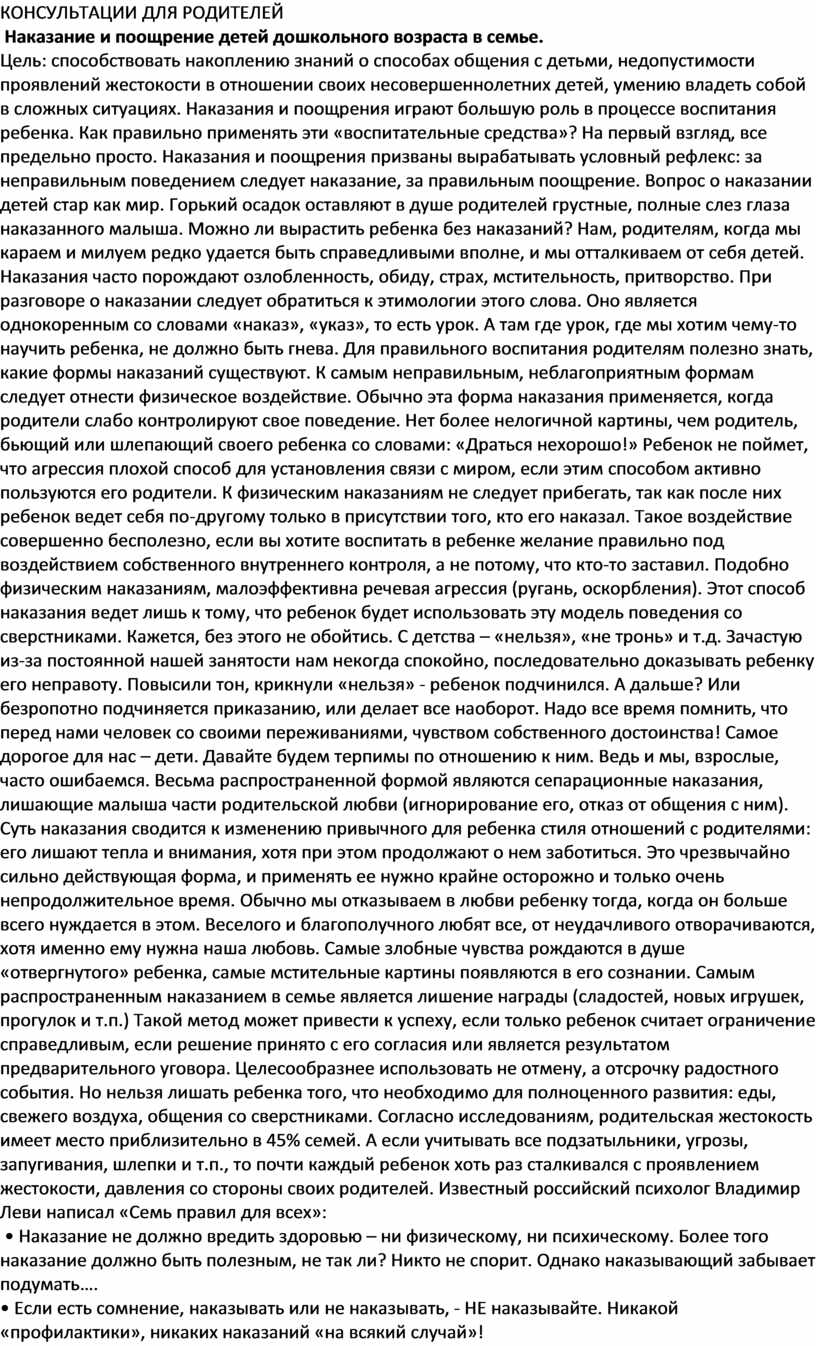 Цель: способствовать накоплению знаний о способах общения с детьми, недопустимости проявлений жестокости в отношении своих несовершеннолетних детей, умению владеть собой в сложных ситуациях. Наказания и поощрения играют большую роль в процессе воспитания ребенка. Как правильно применять эти «воспитательные средства»? На первый взгляд, все предельно просто. Наказания и поощрения призваны вырабатывать условный рефлекс: за неправильным поведением следует наказание, за правильным поощрение. Вопрос о наказании детей стар как мир. Горький осадок оставляют в душе родителей грустные, полные слез глаза наказанного малыша. Можно ли вырастить ребенка без наказаний? Нам, родителям, когда мы караем и милуем редко удается быть справедливыми вполне, и мы отталкиваем от себя детей. Наказания часто порождают озлобленность, обиду, страх, мстительность, притворство. При разговоре о наказании следует обратиться к этимологии этого слова. Оно является однокоренным со словами «наказ», «указ», то есть урок. А там где урок, где мы хотим чему-то научить ребенка, не должно быть гнева. Для правильного воспитания родителям полезно знать, какие формы наказаний существуют. К самым неправильным, неблагоприятным формам следует отнести физическое воздействие. Обычно эта форма наказания применяется, когда родители слабо контролируют свое поведение. Нет более нелогичной картины, чем родитель, бьющий или шлепающий своего ребенка со словами: «Драться нехорошо!» Ребенок не поймет, что агрессия плохой способ для установления связи с миром, если этим способом активно пользуются его родители. К физическим наказаниям не следует прибегать, так как после них ребенок ведет себя по-другому только в присутствии того, кто его наказал. Такое воздействие совершенно бесполезно, если вы хотите воспитать в ребенке желание правильно под воздействием собственного внутреннего контроля, а не потому, что кто-то заставил. Подобно физическим наказаниям, малоэффективна речевая агрессия (ругань, оскорбления). Этот способ наказания ведет лишь к тому, что ребенок будет использовать эту модель поведения со сверстниками. Кажется, без этого не обойтись. С детства – «нельзя», «не тронь» и т.д. Зачастую из-за постоянной нашей занятости нам некогда спокойно, последовательно доказывать ребенку его неправоту. Повысили тон, крикнули «нельзя» - ребенок подчинился. А дальше? Или безропотно подчиняется приказанию, или делает все наоборот. Надо все время помнить, что перед нами человек со своими переживаниями, чувством собственного достоинства! Самое дорогое для нас – дети. Давайте будем терпимы по отношению к ним. Ведь и мы, взрослые, часто ошибаемся. Весьма распространенной формой являются сепарационные наказания, лишающие малыша части родительской любви (игнорирование его, отказ от общения с ним). Суть наказания сводится к изменению привычного для ребенка стиля отношений с родителями: его лишают тепла и внимания, хотя при этом продолжают о нем заботиться. Это чрезвычайно сильно действующая форма, и применять ее нужно крайне осторожно и только очень непродолжительное время. Обычно мы отказываем в любви ребенку тогда, когда он больше всего нуждается в этом. Веселого и благополучного любят все, от неудачливого отворачиваются, хотя именно ему нужна наша любовь. Самые злобные чувства рожд
