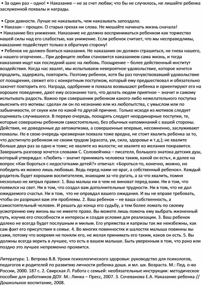 Литература: 1. Ветрова В.В. Уроки психологического здоровья: руководство для психологов, педагогов и родителей по развитию личности ребенка дошк. и мл. шк. Возраста. М.: Пед. о-во России, 2000. 187 с. 2. Свирская Л. Работа с семьей: необязательные инструкции: методическое пособие для работников ДОУ. М.: Линка – Пресс, 2007. 3. Сочеванова Е.А. Наказание ребенка // Дошкольное воспитание, 2008.