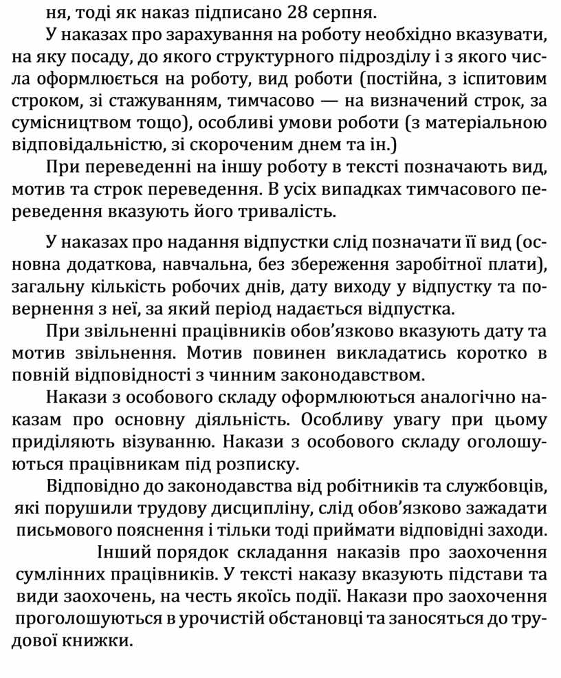 Наказ вступає в силу з моменту підписання. Однак окремі параграфи наказу можуть мати свої терміни. Наприклад, при- значення працівника на посаду може бути проведено з 1 верес- ня, тоді як наказ підписано 28 серпня.