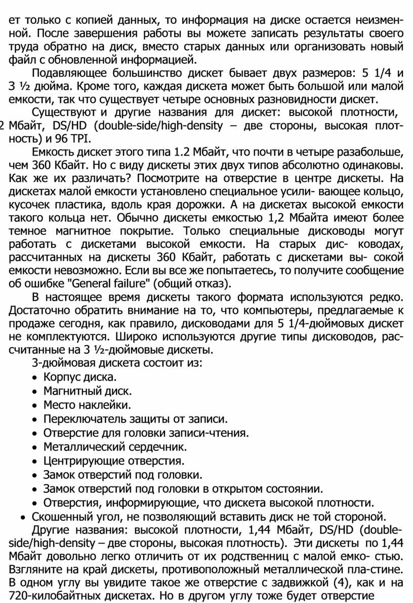 Емкость дискет этого типа 1.2 Мбайт, что почти в четыре раза больше, чем 360 Кбайт. Но с виду дискеты этих двух типов абсолютно одинаковы. Как же их различать? Посмотрите на отверстие в центре дискеты. На дискетах малой емкости установлено специальное усили- вающее кольцо, кусочек пластика, вдоль края дорожки. А на дискетах высокой емкости такого кольца нет. Обычно дискеты емкостью 1,2 Мбайта имеют более темное магнитное покрытие. Только специальные дисководы могут работать с дискетами высокой емкости. На старых дис- ководах, рассчитанных на дискеты 360 Кбайт, работать с дискетами вы- сокой емкости невозможно. Если вы все же попытаетесь, то получите сообщение об ошибке "General failure" (общий отказ).