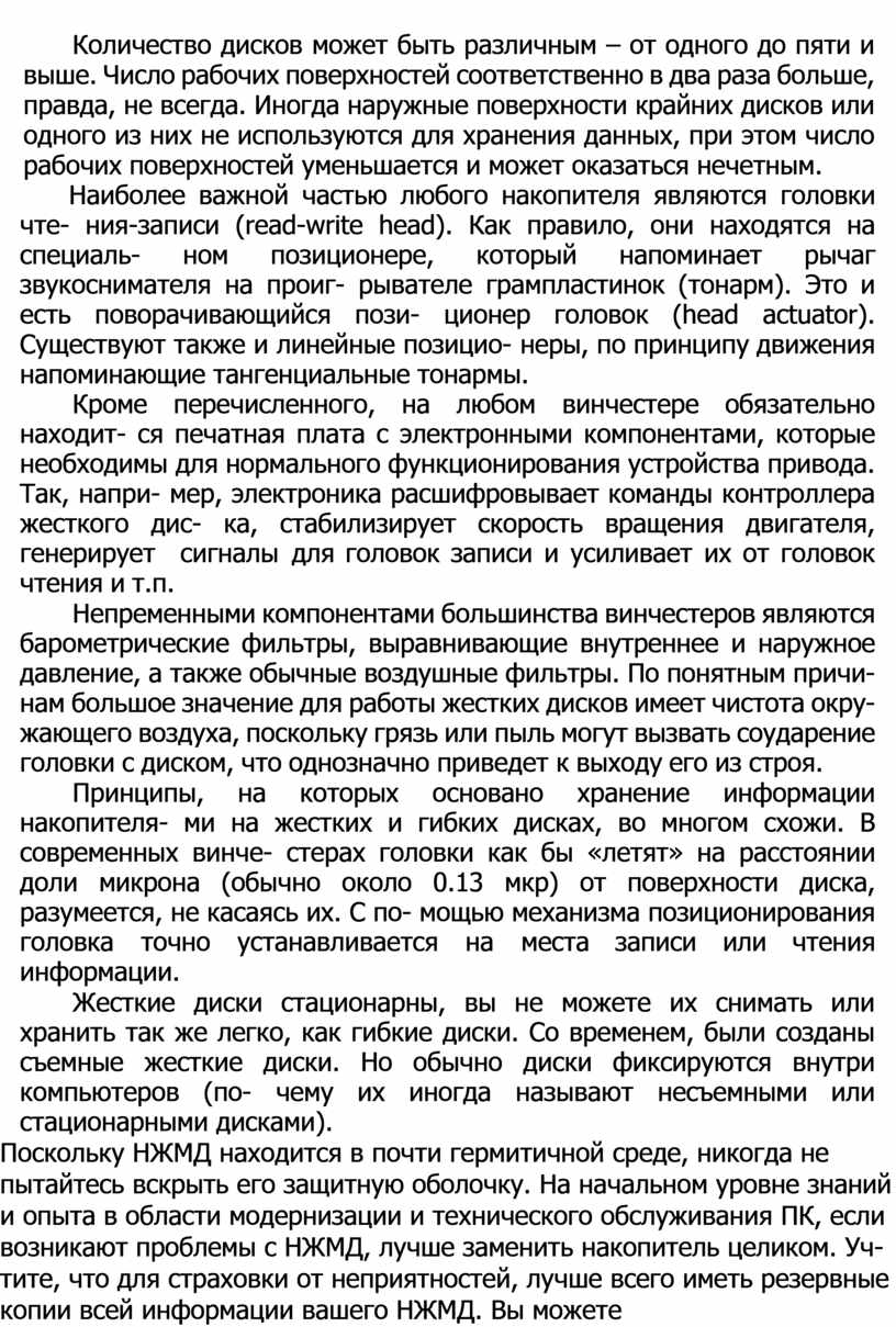 Принципы, на которых основано хранение информации накопителя- ми на жестких и гибких дисках, во многом схожи. В современных винче- стерах головки как бы «летят» на расстоянии доли микрона (обычно около 0.13 мкр) от поверхности диска, разумеется, не касаясь их. С по- мощью механизма позиционирования головка точно устанавливается на места записи или чтения информации.