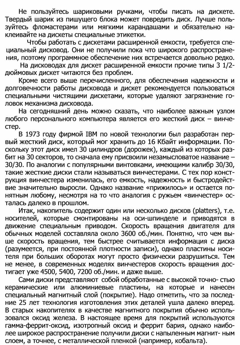 В 1973 году фирмой IBM по новой технологии был разработан пер- вый жесткий диск, который мог хранить до 16 Кбайт информации. По- скольку этот диск имел 30 цилиндров (дорожек), каждый из которых раз- бит на 30 секторов, то сначала ему присвоили незамысловатое название – 30/30. По аналогии с популярными винтовками, имеющими калибр 30/30, такие жесткие диски стали называться винчестерами. С тех пор конст- рукция винчестера изменилась, его емкость, надежность и быстродейст- вие значительно выросли. Однако название «прижилось» и остается по- нятным любому, несмотря на то что аналогия с ружьем «винчестер» ос- талась далеко в прошлом.