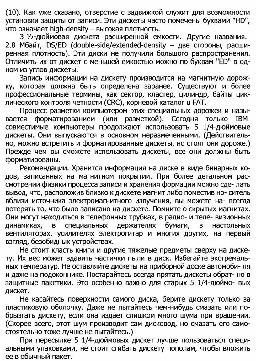 Не стоит класть книги и другие тяжелые предметы сверху на диске- ту. Их вес может вдавить частички пыли в диск. Избегайте экстремаль- ных температур. Не оставляйте дискеты на приборной доске автомоби- ля и даже на подоконнике. Постарайтесь всегда прятать дискеты обрат- но в защитные пакетики. Это особенно важно для старых 5 1/4-дюймо- вых дискет.