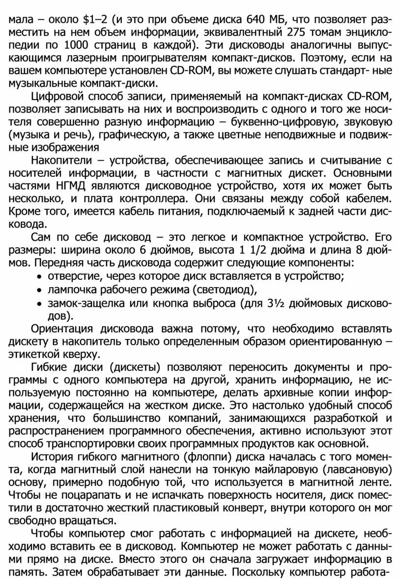 Чтобы компьютер смог работать с информацией на дискете, необ- ходимо вставить ее в дисковод. Компьютер не может работать с данны- ми прямо на диске. Вместо этого он сначала загружает информацию в память. Затем обрабатывает эти данные. Поскольку компьютер работа-