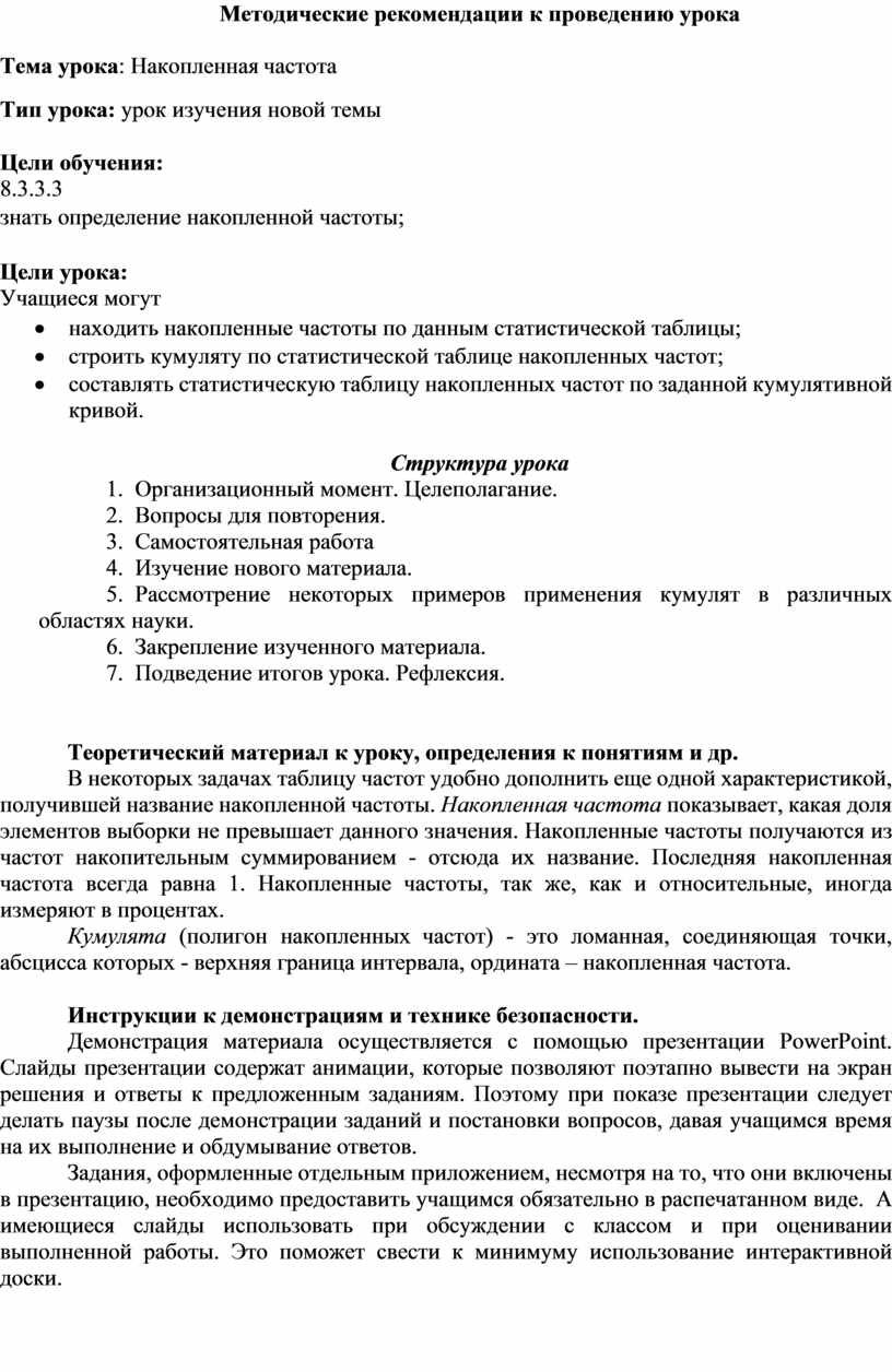 В некоторых задачах таблицу частот удобно дополнить еще одной характеристикой, получившей название накопленной частоты. Накопленная частота показывает, какая доля элементов выборки не превышает данного значения. Накопленные частоты получаются из частот накопительным суммированием - отсюда их название. Последняя накопленная частота всегда равна 1. Накопленные частоты, так же, как и относительные, иногда измеряют в процентах.
