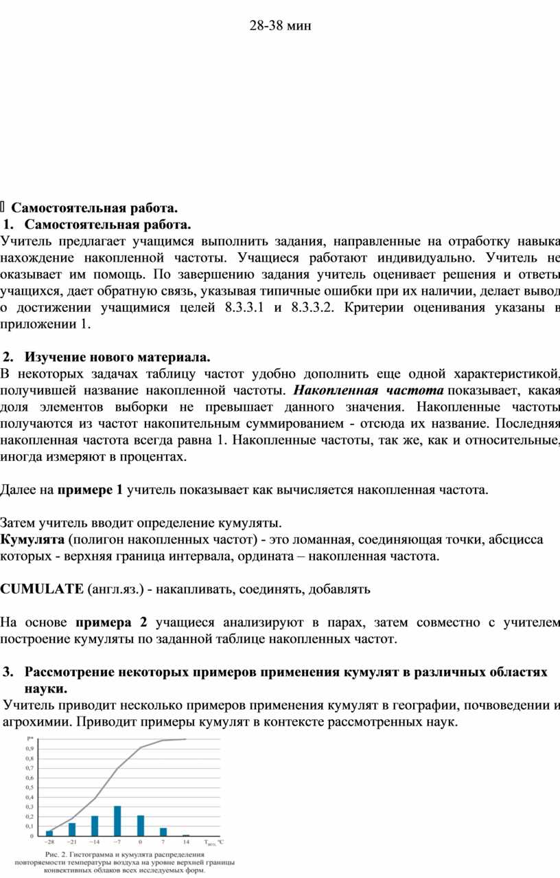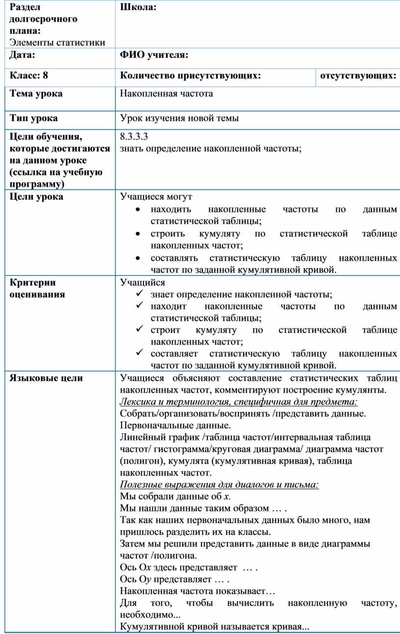 3. Самостоятельная работа. Учитель предлагает учащимся выполнить задания, направленные на отработку навыка нахождение накопленной частоты. Учащиеся работают индивидуально. Учитель не оказывает им помощь. По завершению задания учитель оценивает решения и ответы учащихся, дает обратную связь, указывая типичные ошибки при их наличии, делает вывод о достижении учащимися целей 8.3.3.1 и 8.3.3.2. Критерии оценивания указаны в приложении 1.