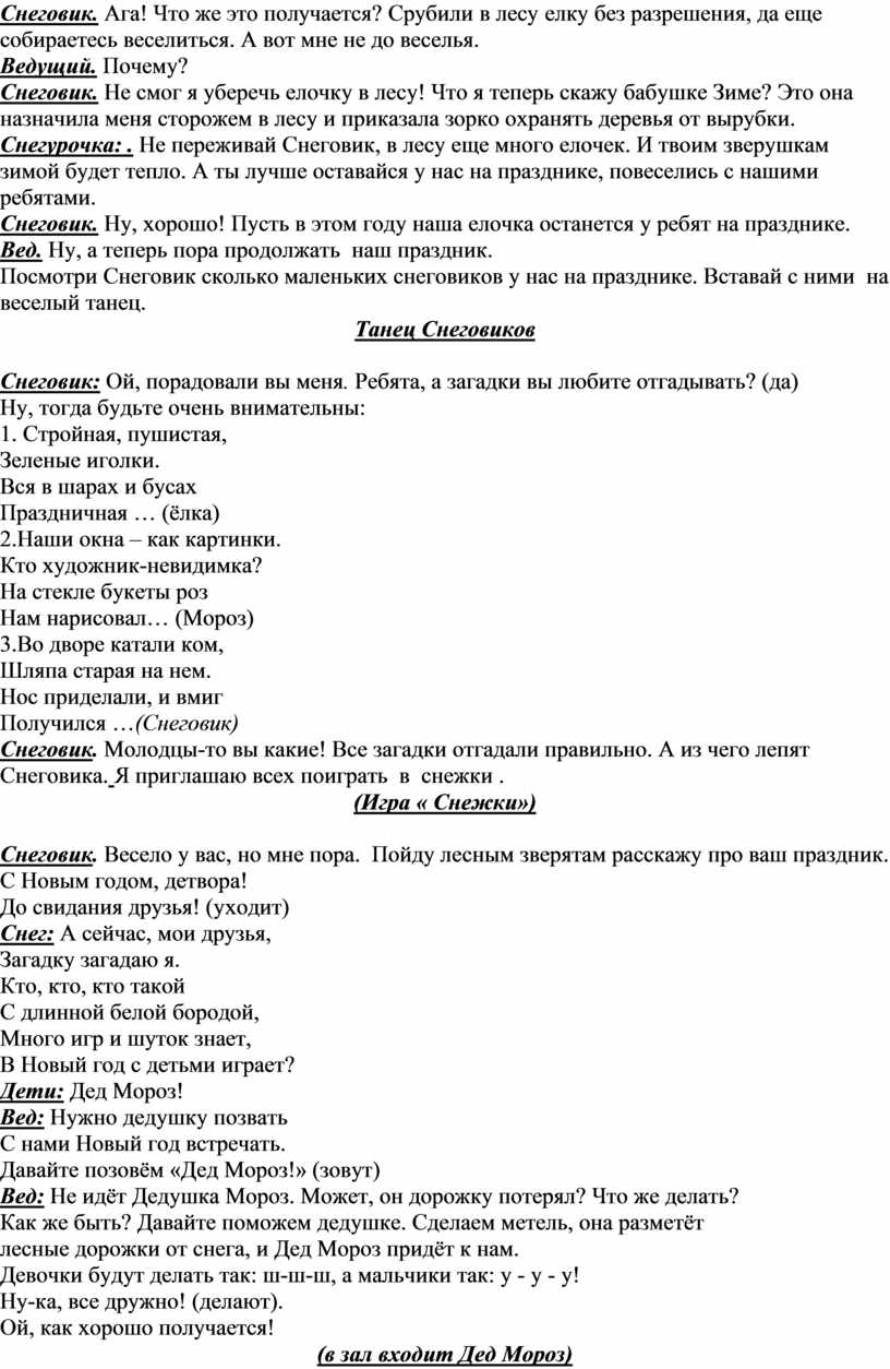 Снегурочка: . Не переживай Снеговик, в лесу еще много елочек. И твоим зверушкам зимой будет тепло. А ты лучше оставайся у нас на празднике, повеселись с нашими ребятами.