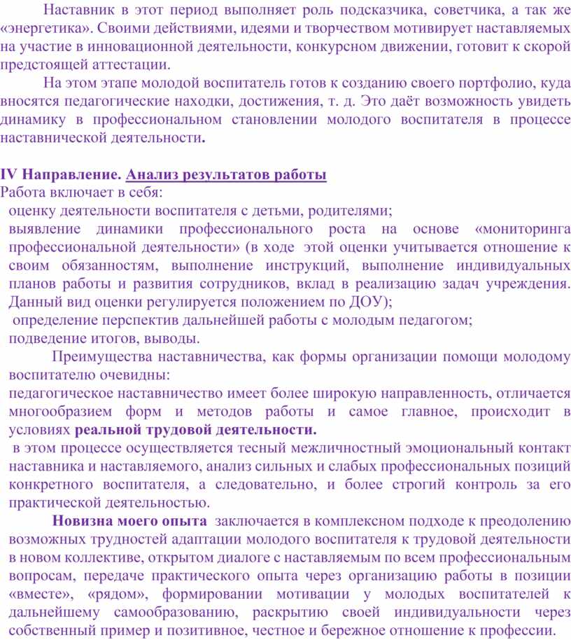 · в этом процессе осуществляется тесный межличностный эмоциональный контакт наставника и наставляемого, анализ сильных и слабых профессиональных позиций конкретного воспитателя, а следовательно, и более строгий контроль за его практической деятельностью.