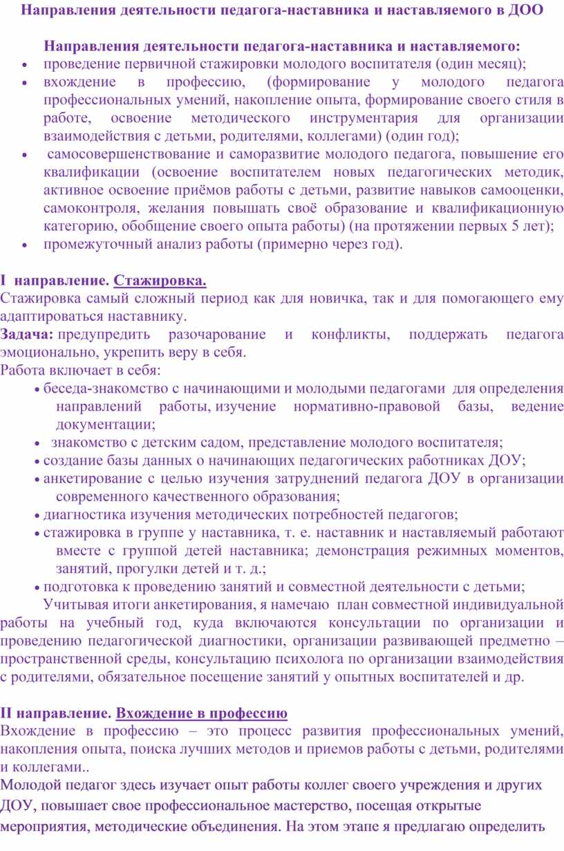 Направления деятельности педагога-наставника и наставляемого в ДОО