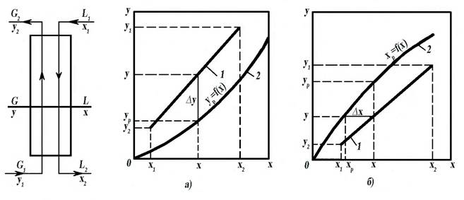 Припустимо, що масопередача відбувається між фазами Фу і Фх, робочі концентрації яких дорівнюють у та х відповідно. Якщо, наприклад, робоча лінія розташована вище лінії рівноваги yр=f(x) (рис 4.2а), то для будь-якої точки робочої лінії у>ур і х < хр, де ур і хр - рівноважні концентрації компонента у відповідних фазах. Оскільки система прагне до фазової рівноваги, то розподільний компонент у цьому випадку буде переходити з фази Фу у фазу Фх, а рушійну силу процесу в будь-якій точці апарата можна виразити в концентраціях фази Фу - ∆у = у – ур. Якщо ж робоча лінія розташована нижче лінії рівноваги, вираженої функцією xр=f(x) (рис.4.2б), то для будь-якої точки, довільно обраної на робочій лінії, х > хр і у < ур, а рушійна сила процесу буде дорівнювати Δх = х – хр.