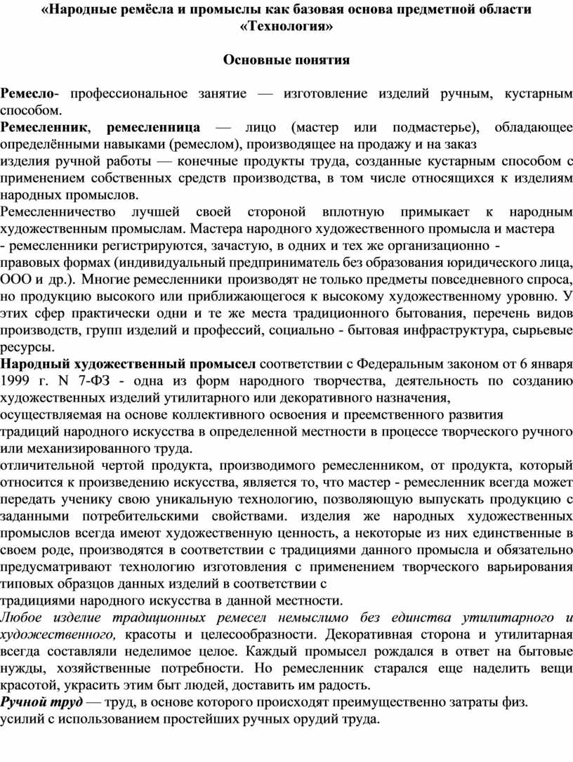 «Народные ремёсла и промыслы как базовая основа предметной области
