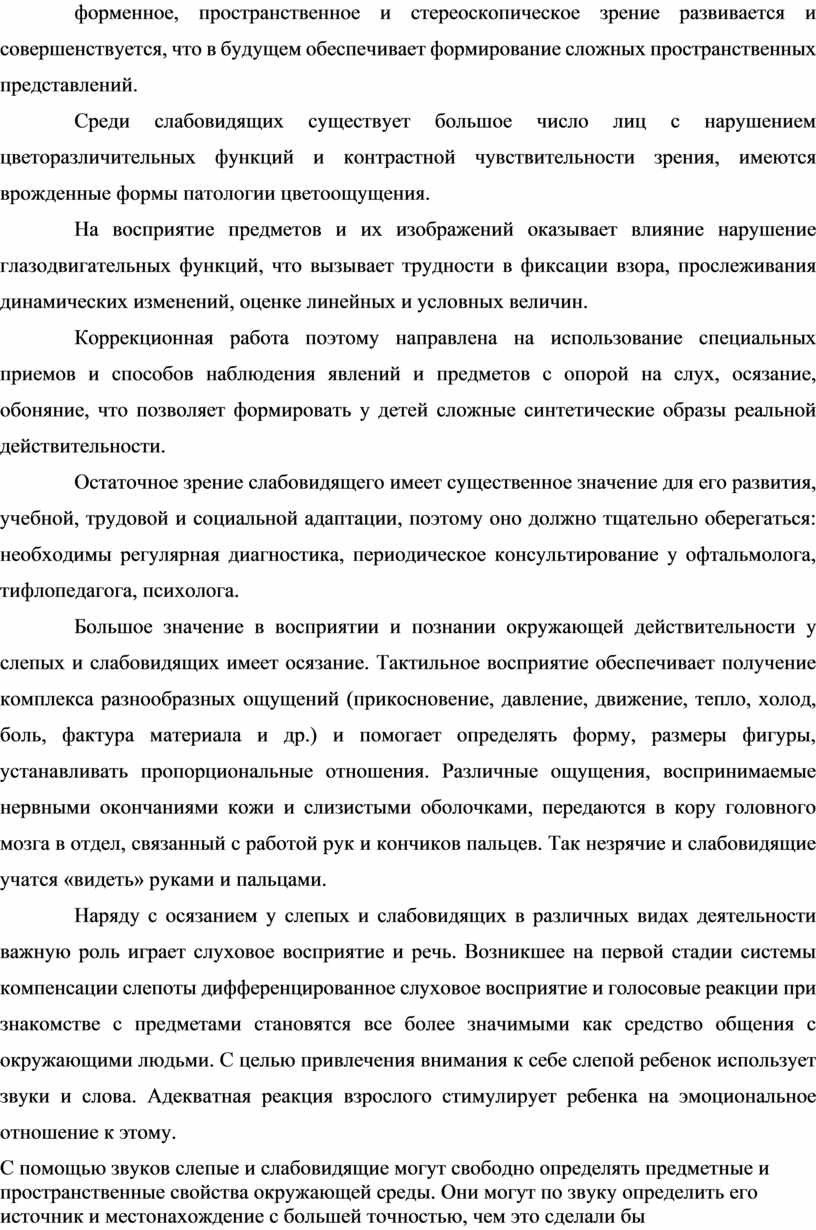Компенсаторная перестройка во многом зависит от сохранности зрения. Даже незначительные остатки зрения важны для ориентации и познавательной деятельности лиц с глубокими зрительными нарушениями.