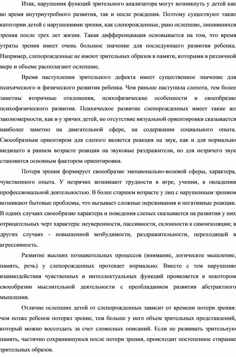 Итак, нарушения функций зрительного анализатора могут возникнуть у детей как во время внутриутробного развития, так и после рождения. Поэтому существуют такие категории детей с нарушениями зрения, как слепорожденные, рано ослепшие, лишившихся зрения после трех лет жизни. Такая дифференциация основывается на том, что время утраты зрения имеет очень большое значение для последующего развития ребенка. Например, слепорожденные не имеют зрительных образов в памяти, которыми в различной мере и объеме располагают ослепшие.
